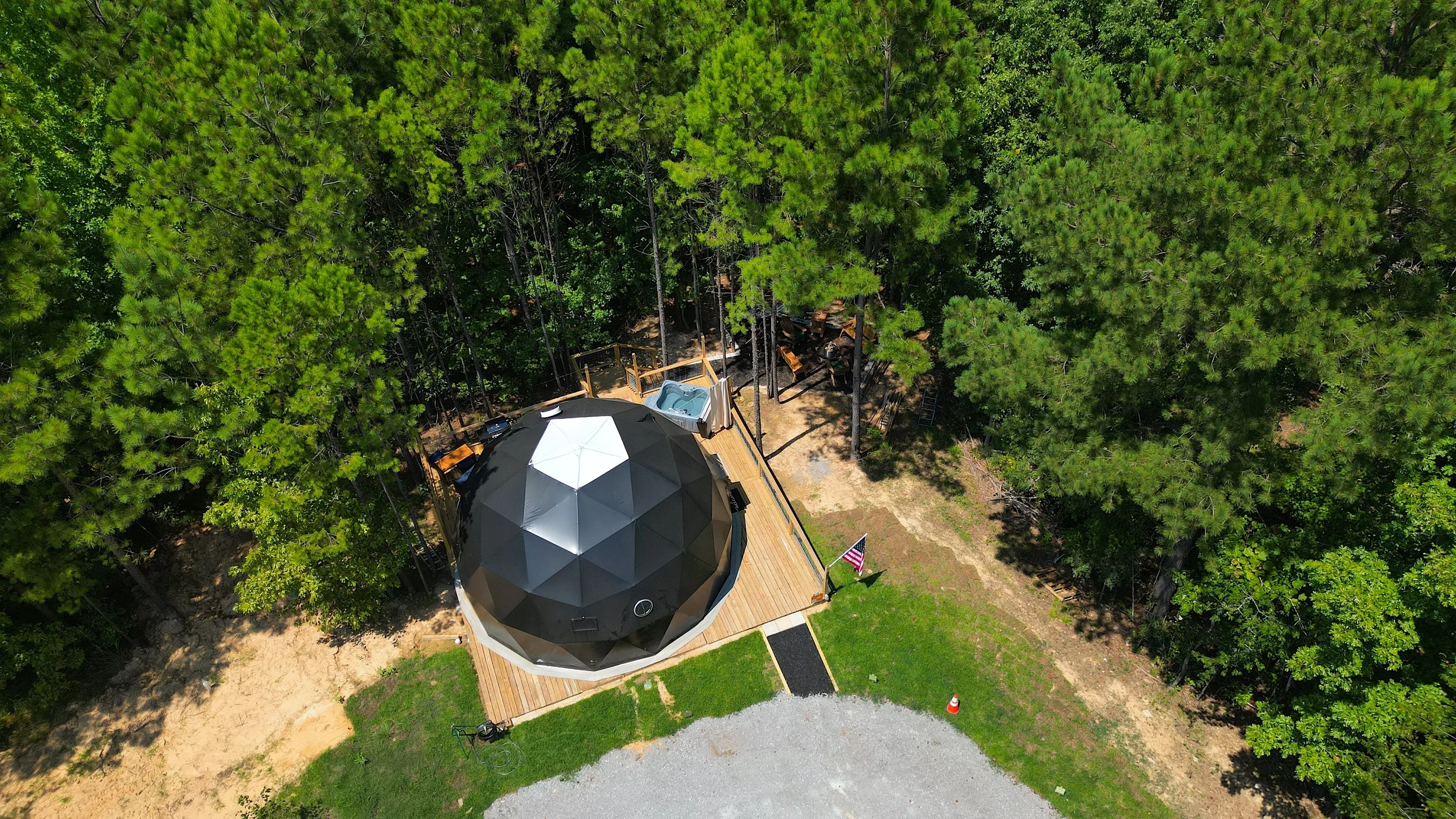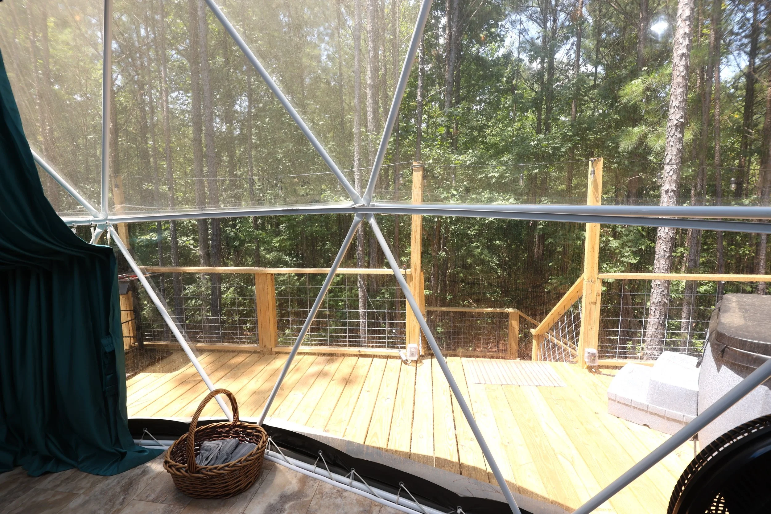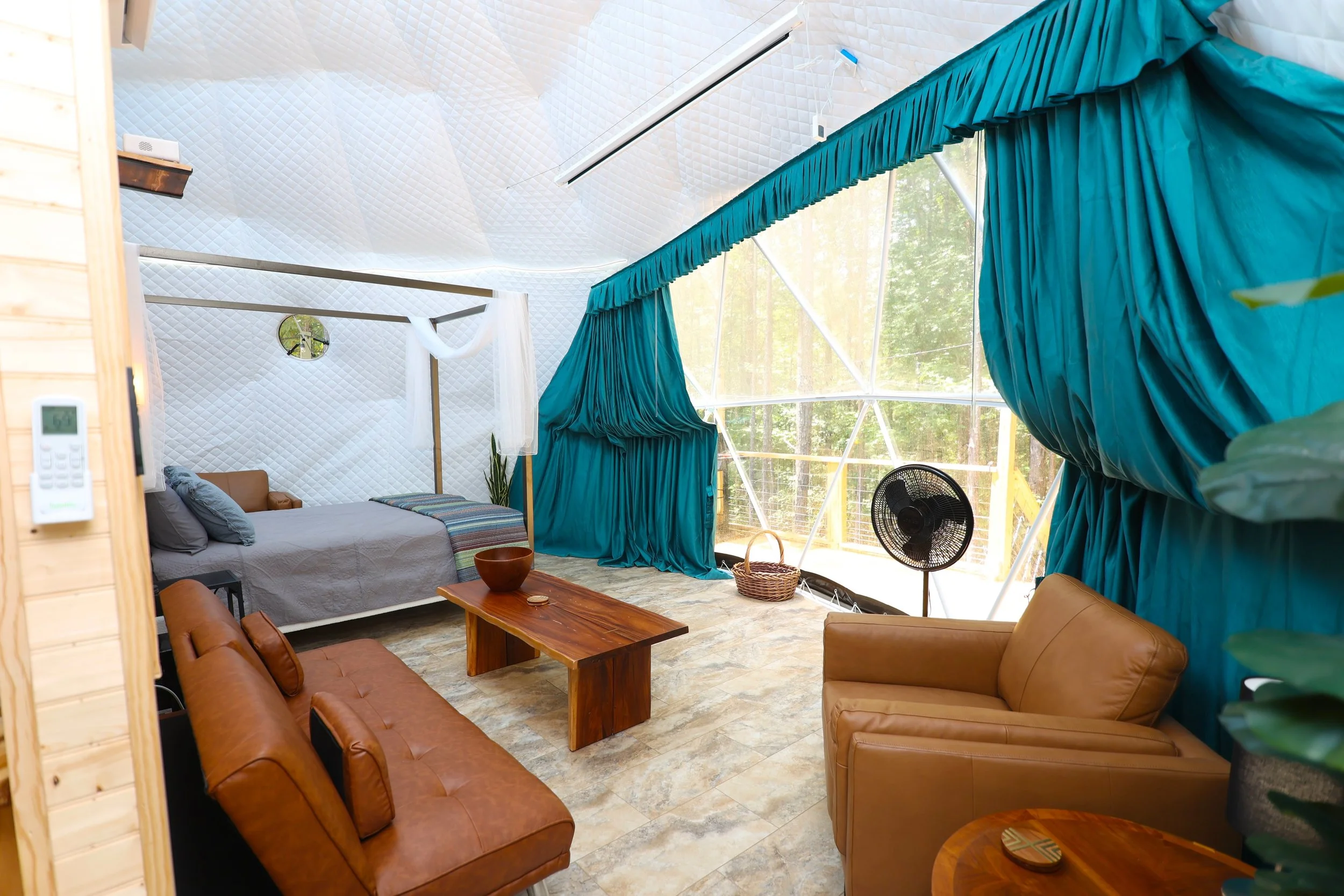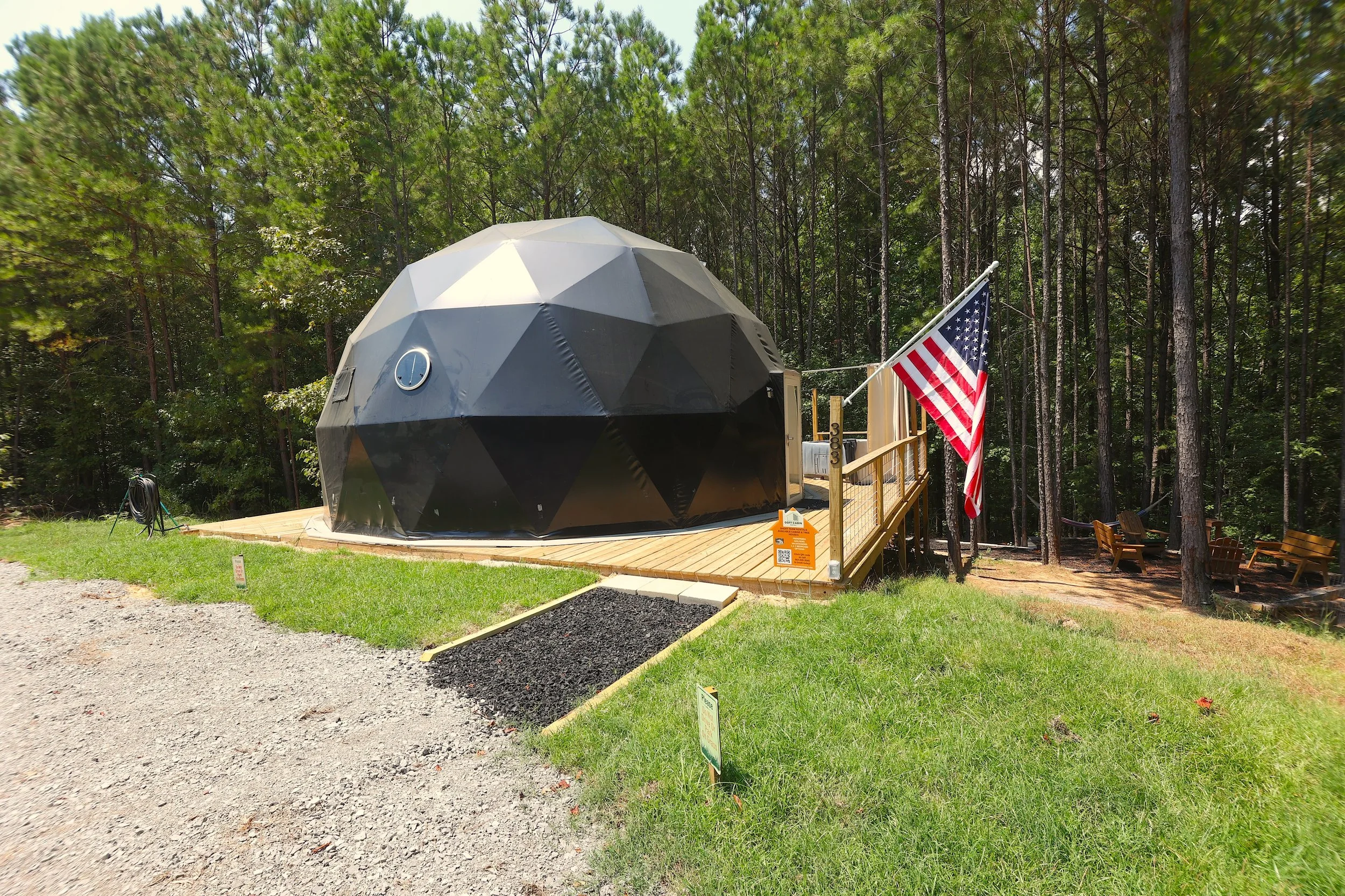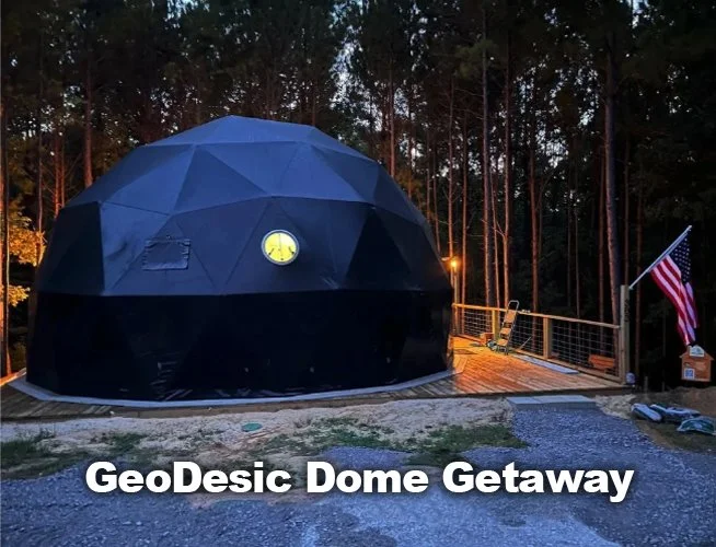 Escape to our one-of-a-kind 26.5-foot diameter Geodesic Dome with a soaring 16-foot ceiling inside. This open and airy retreat combines comfort, style, and a touch of adventure.