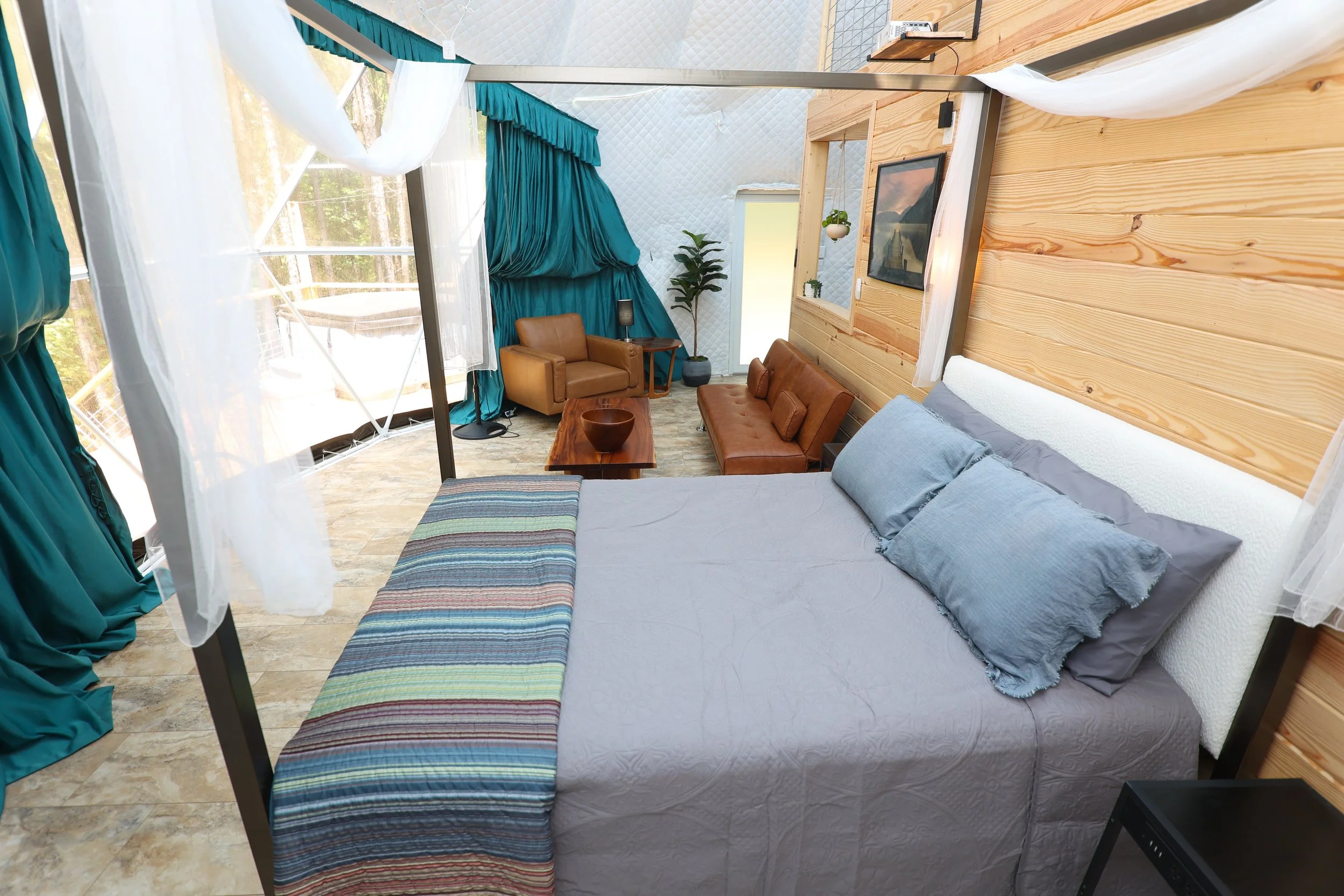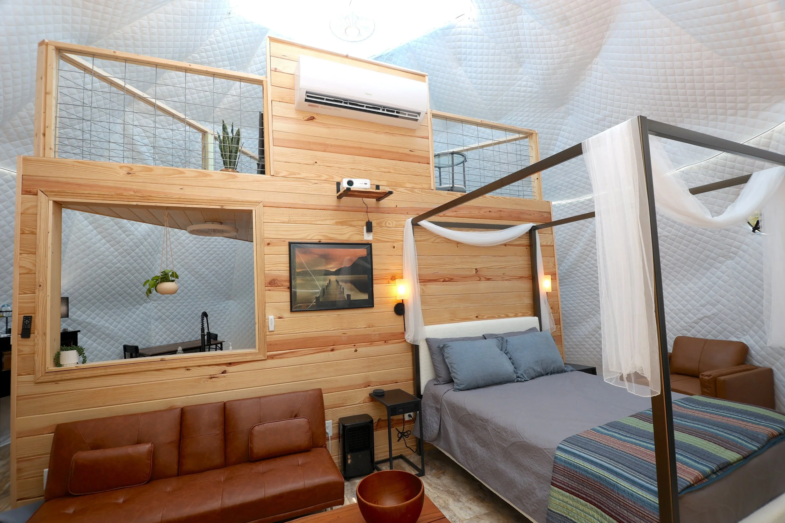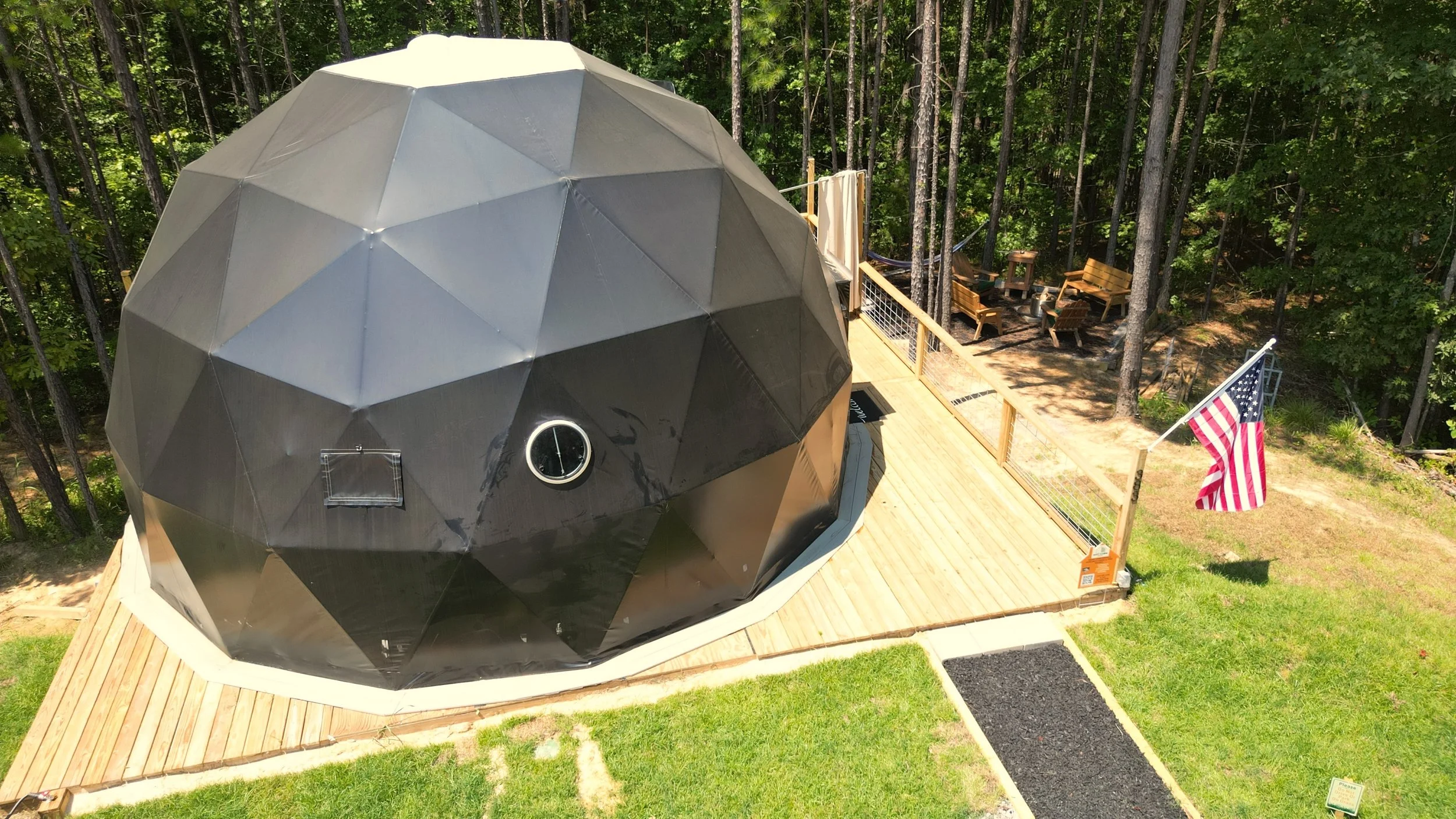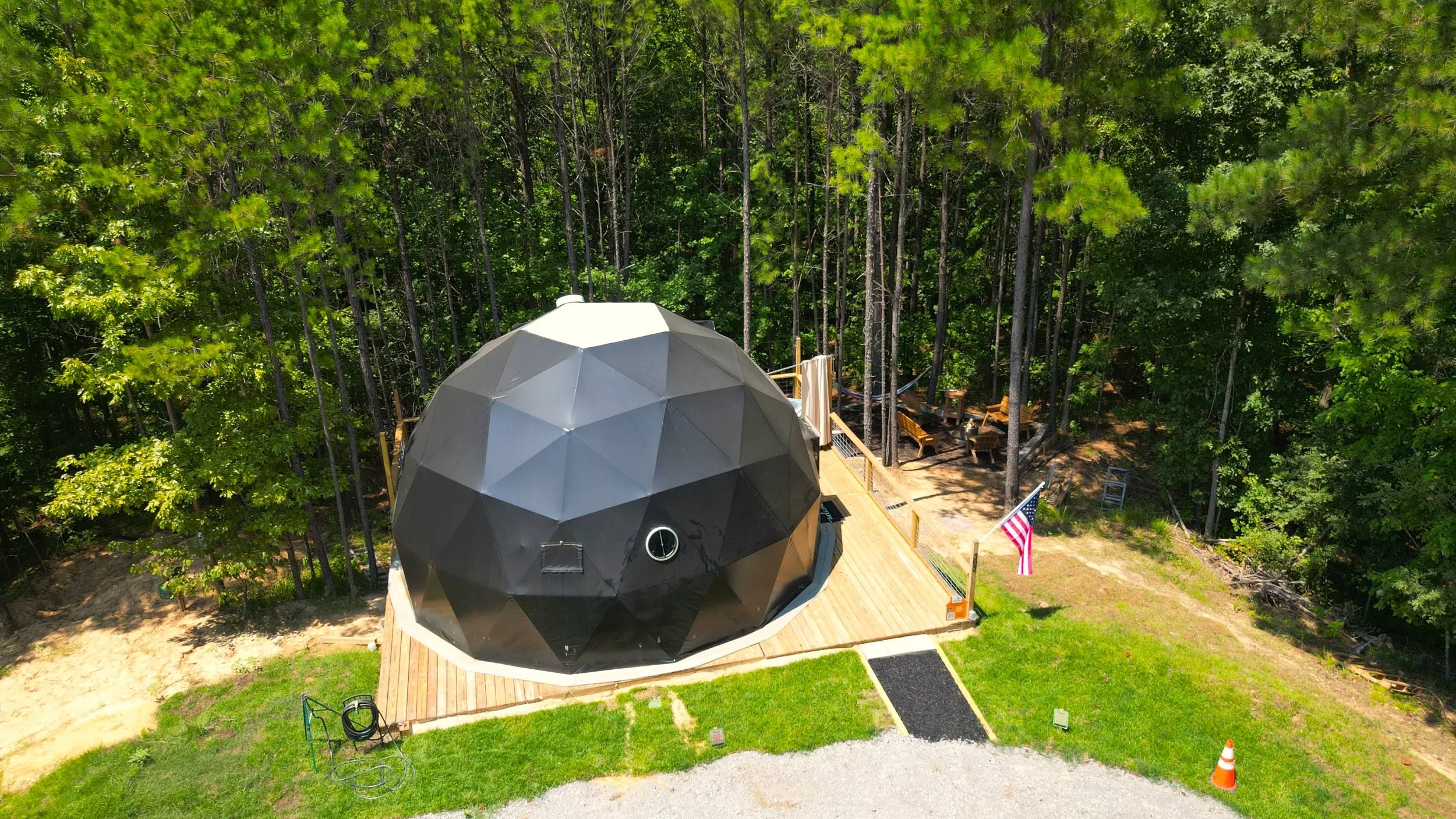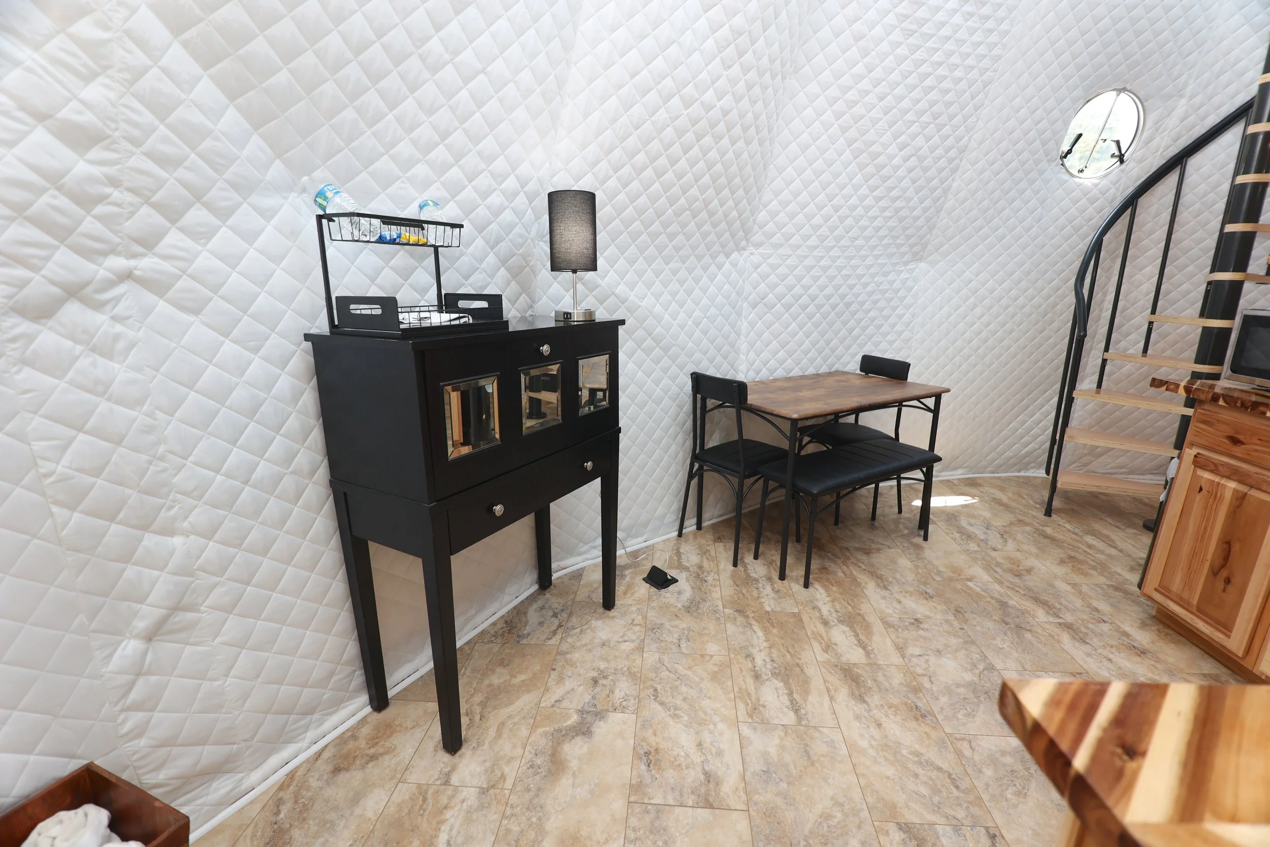 Escape to our one-of-a-kind 26.5-foot diameter Geodesic Dome with a soaring 16-foot ceiling inside. This open and airy retreat combines comfort, style, and a touch of adventure.