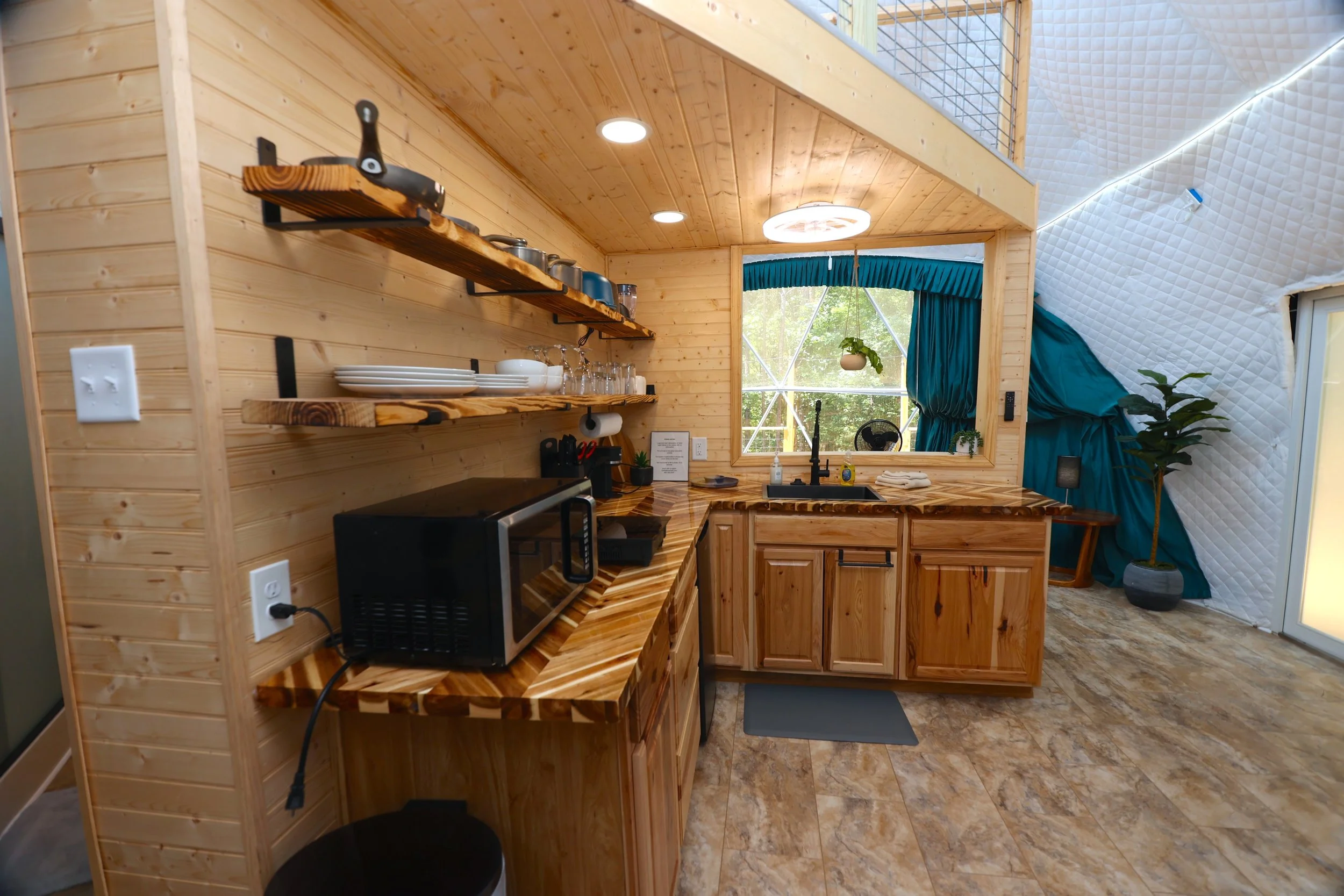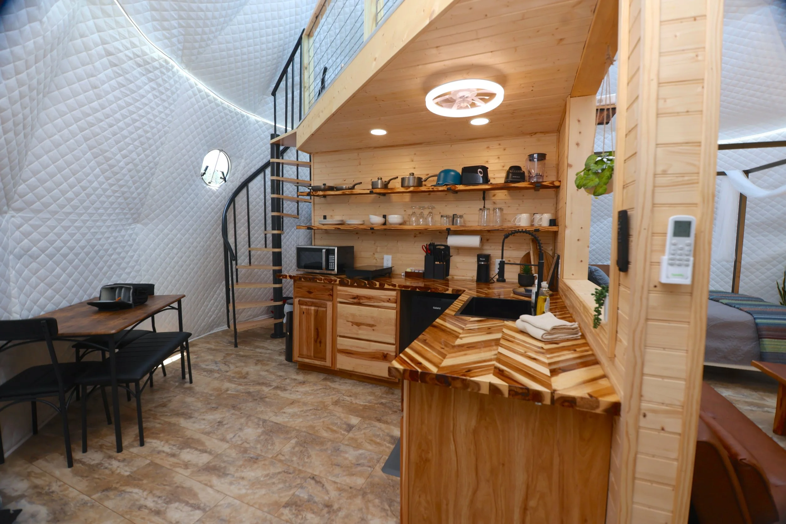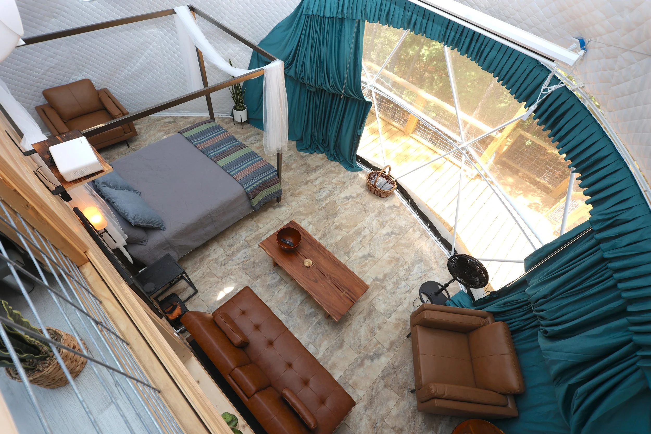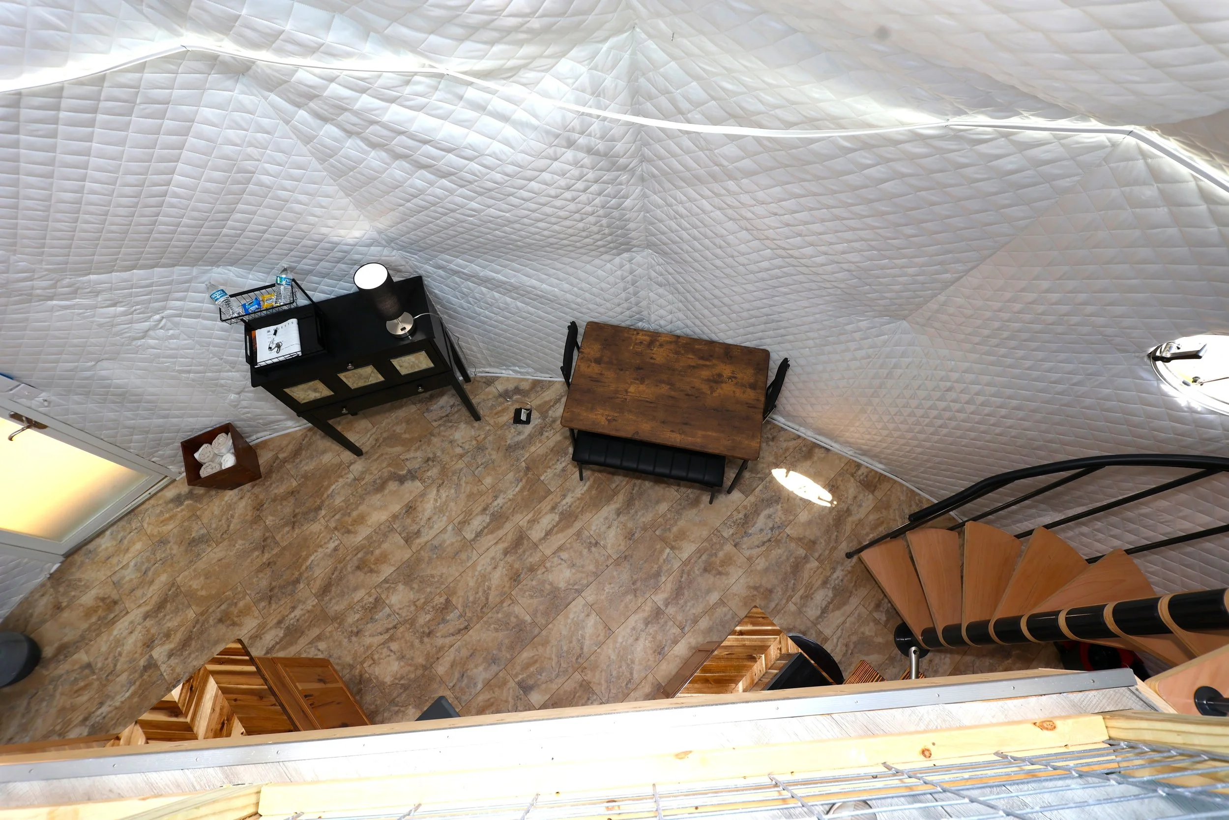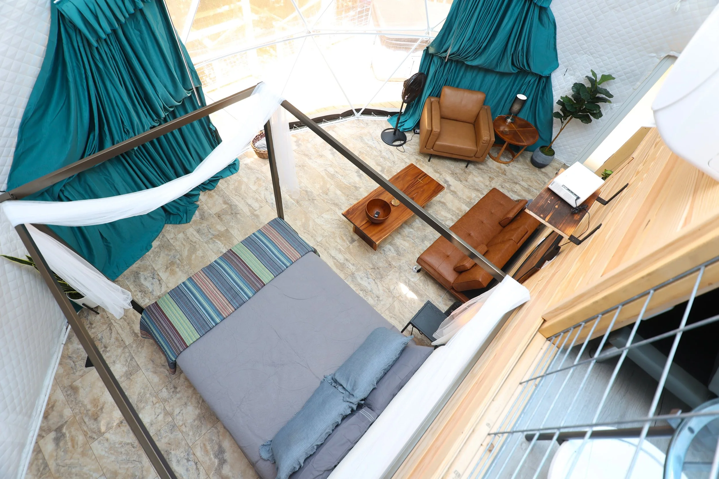 Escape to our one-of-a-kind 26.5-foot diameter Geodesic Dome with a soaring 16-foot ceiling inside. This open and airy retreat combines comfort, style, and a touch of adventure.