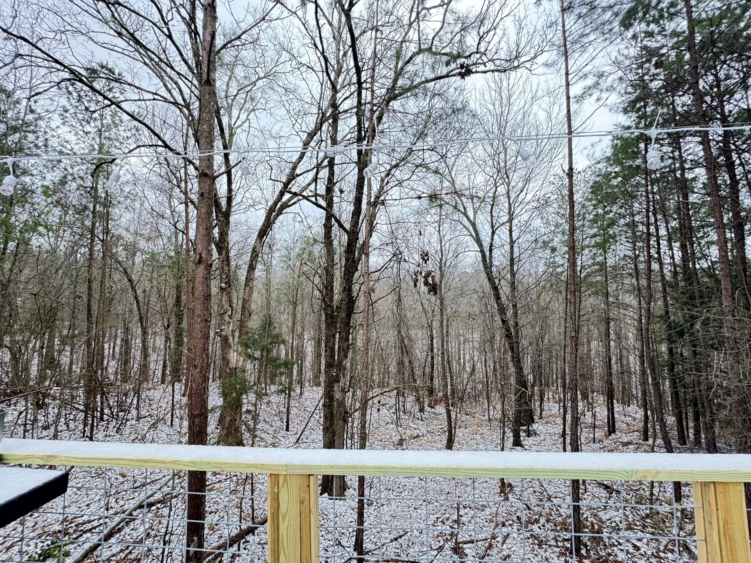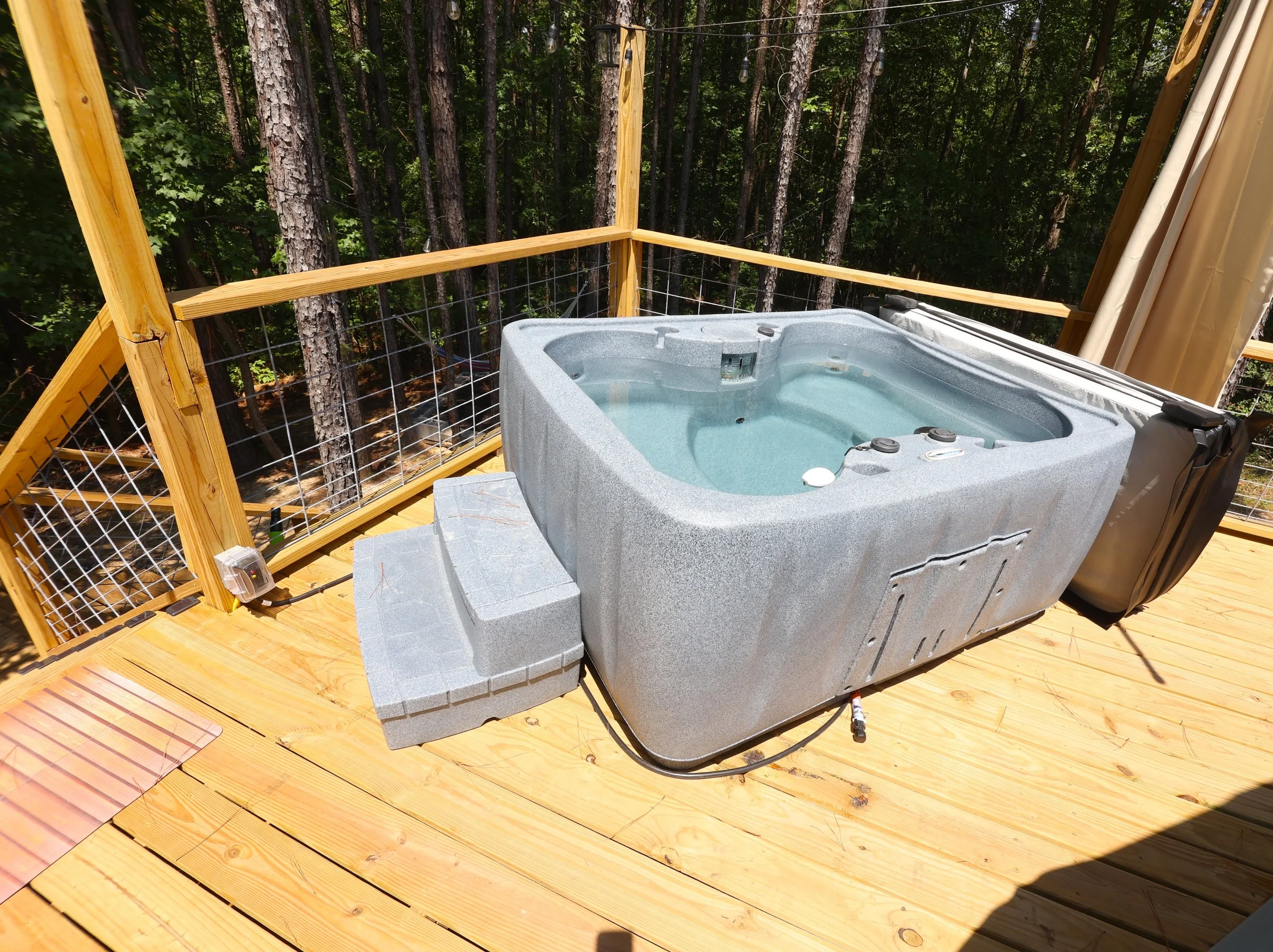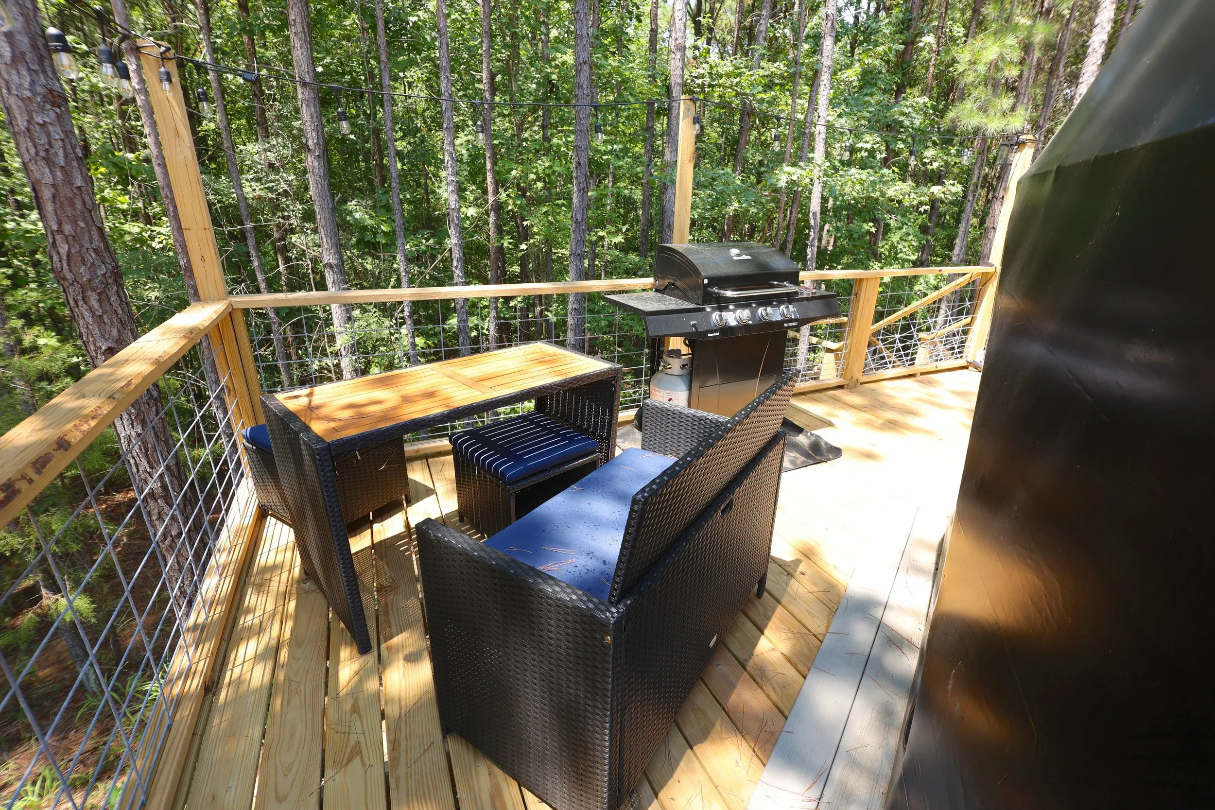 The deck on the back has a hot tub for relaxation, a gas grill, and a fire pit for the ultimate getaway. Enjoy the views of wildlife from 14 feet up above the floor of the forest.