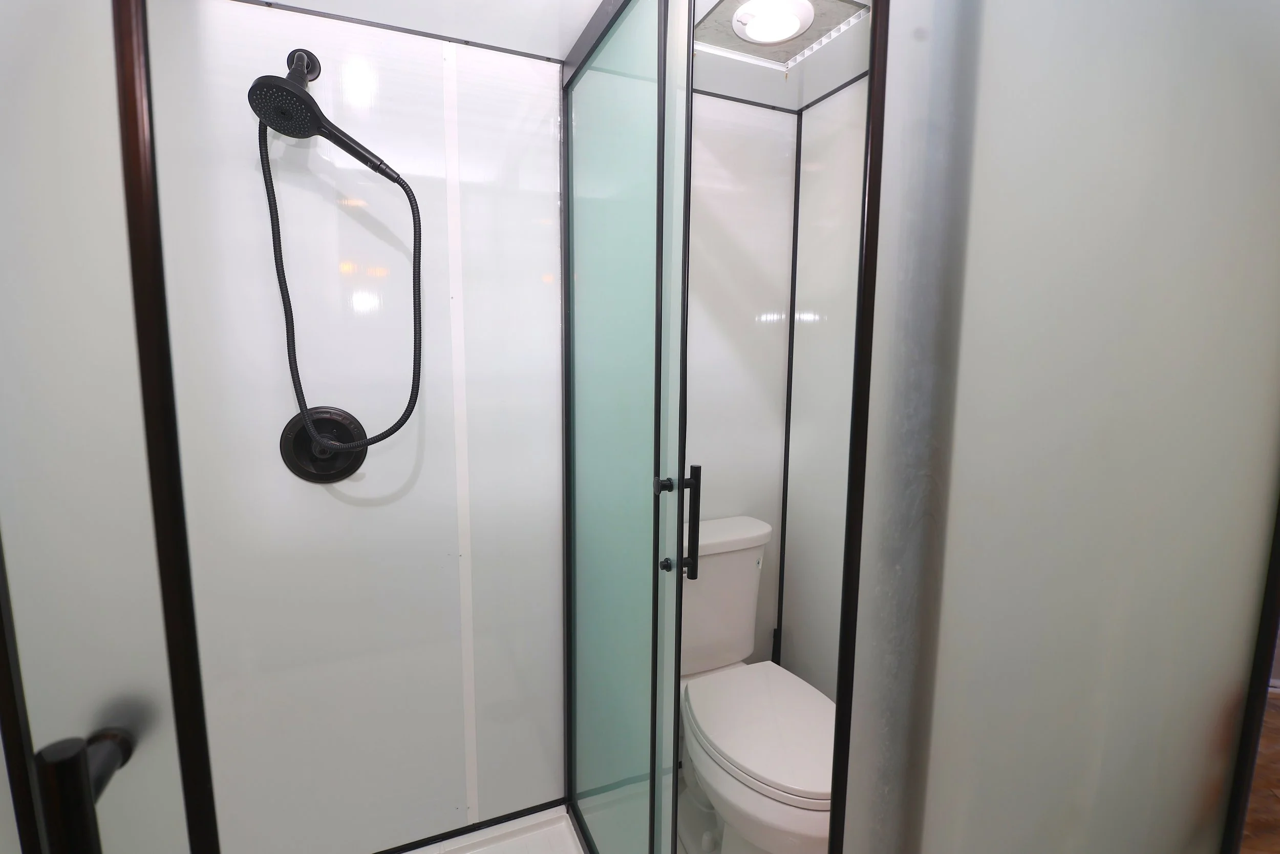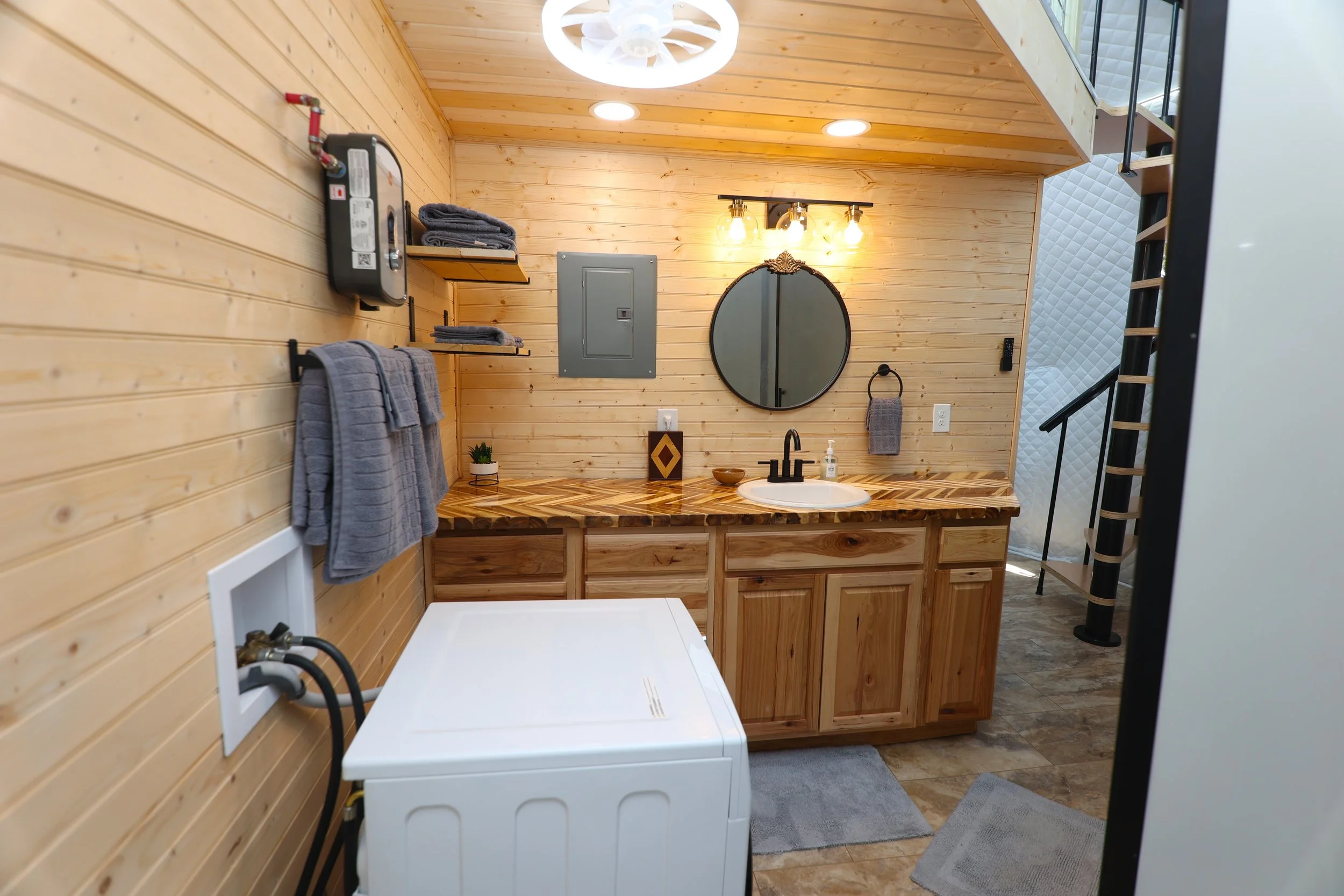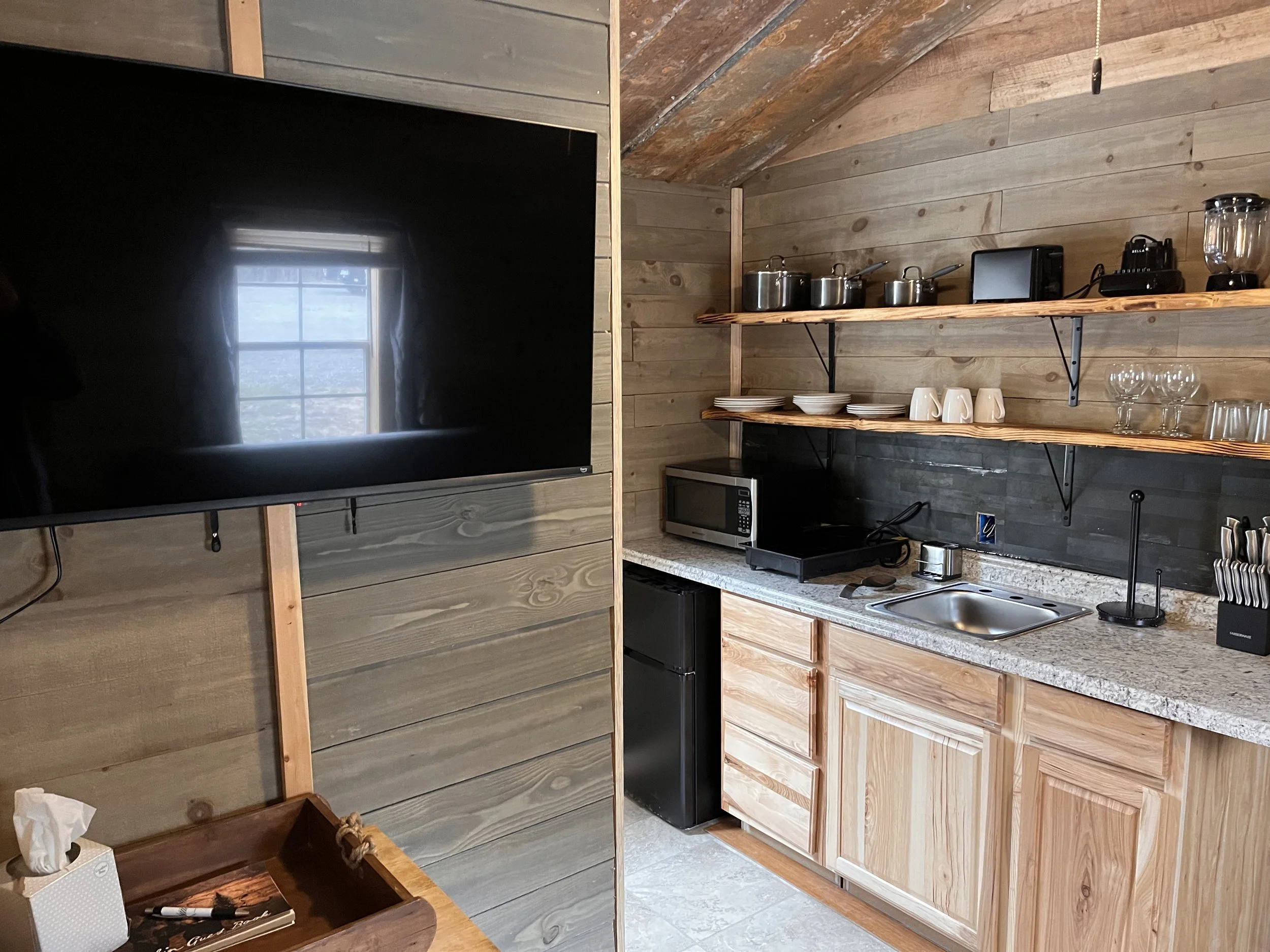 Inside the cabin is fully furnished, with a loft with a comfortable queen-size bed and a comfortable couch downstairs that converts into a queen-size Serta mattress bed. The kitchen is fully stocked for anything you might need to cook during your getaway. The beautiful bathroom has a tiled shower and is also stocked with shampoo and body wash.